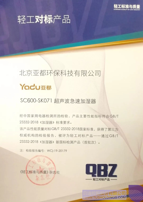 啟迪企業(yè)丨亞都SC600-SK071急速加濕器被評為首批次通過新國標(biāo)檢測產(chǎn)品打印